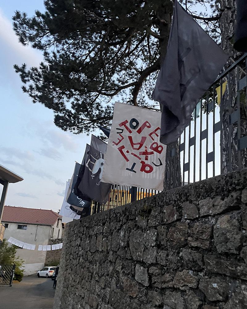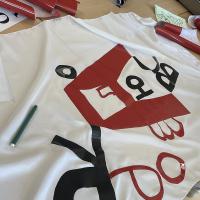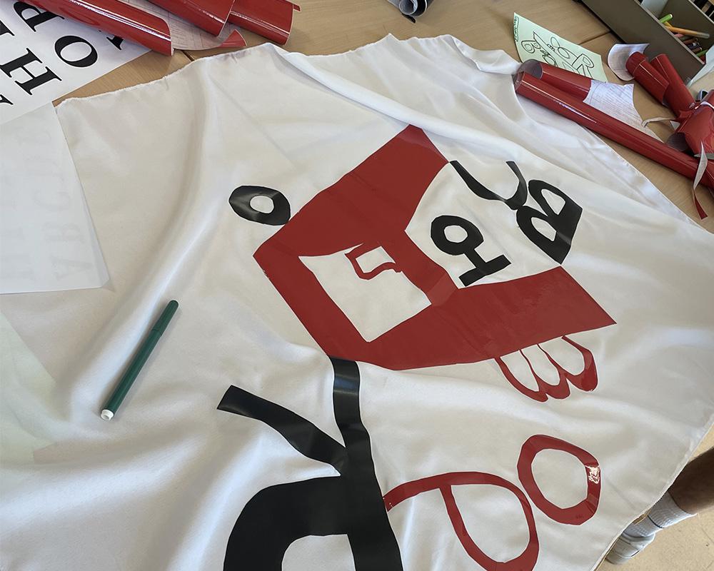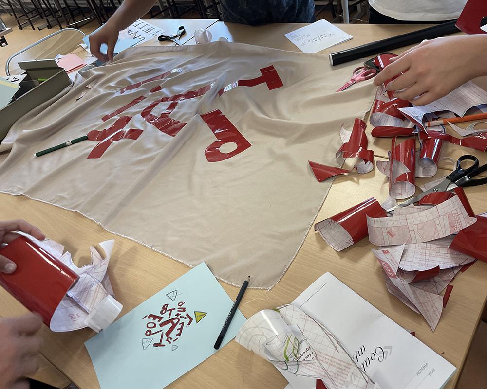 Les élèves ont d’abord travaillé autour des émotions, qu’ils ont traduites en mots, mêlant alphabet latin et cyrillique pour composer un poème collectif. De cette matière sensible est née une production plastique : un « drapeau émotionnel », où lettres et symboles deviennent rythmes graphiques et couleurs de l’émotion partagée.
