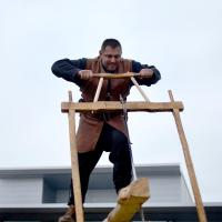 Après avoir construit le camp durant le week-end précédent la compagnie des « Bâtisseurs d'Antan » se montrait opérationnelle le vendredi 4 mai dès 7h30 du matin pour accueillir au portail les collégiens et lycéens devant participer aux divers ateliers consacrés aux métiers d'autrefois. Toutes les demi-heures les différents groupes s’essayaient à la forge, auprès du tailleur de pierre, auprès des scieurs de planches et des tresseurs de corde. Sortis du cadre scolaire ordinaire, ils pouvaient expérimenter Pythagore autrement qu'à travers le théorème, ils découvraient la corde à nœuds et les chiffres 3,4,5 bien connus des artisans pour déterminer un angle droit. Les diverses activités les ramenaient à la dure pénibilité des tâches physiques du scieur de bois, du poids des outils, de la répétition des gestes. Vers 19h ils revenaient accompagnés de leurs parents pour profiter des grillades et diverses victuailles, banquet organisé par les parents de l'Apel. Pendant ce temps nos gens en costumes festoyaient autour du feu de camp et en partageant un repas traditionnel cuit dans la marmite et dont les effluves éveillaient les sens. En soirée ils reprenaient la main en entrainant les trainards dans des danses traditionnelles et d'époque. Evoluant au rythme naturel du soleil, c'est donc très tôt que la compagnie était sur pied pour accueillir le samedi les élèves de BTS en design graphique et de produits. L'équipe pédagogique en accord avec les « Bâtisseurs d'Antan » avaient préparé les projets en amont pour chaque classe à travers l'élaboration de maquettes ou de dessins. Les élèves de design de produits avaient pour mission de construire un engin de levage à l’échelle 1 de plus de 3 m de haut, assemblé par emboitement et grâce à des chevilles en bois. Le second groupe prenait possession de l'atelier du tailleur de pierre et passait la journée à finaliser leur bestiaire dans le dur. L'ensemble des intervenants se retrouvait le soir pour partager un aligot cuisiné par les élèves de BTS en mécanique. La journée de samedi était l'occasion de recevoir les habitants de Langogne qui, timides le matin, dès 14h investissaient les lieux pour assister aux ateliers et aux démonstrations des « Mercenaires » en arme, seconde compagnie en démonstration le samedi. Combats en armure, tir à la bricole (catapulte de petite taille) occupaient la cour de l'établissement scolaire au grand bonheur des enfant set adultes présents.