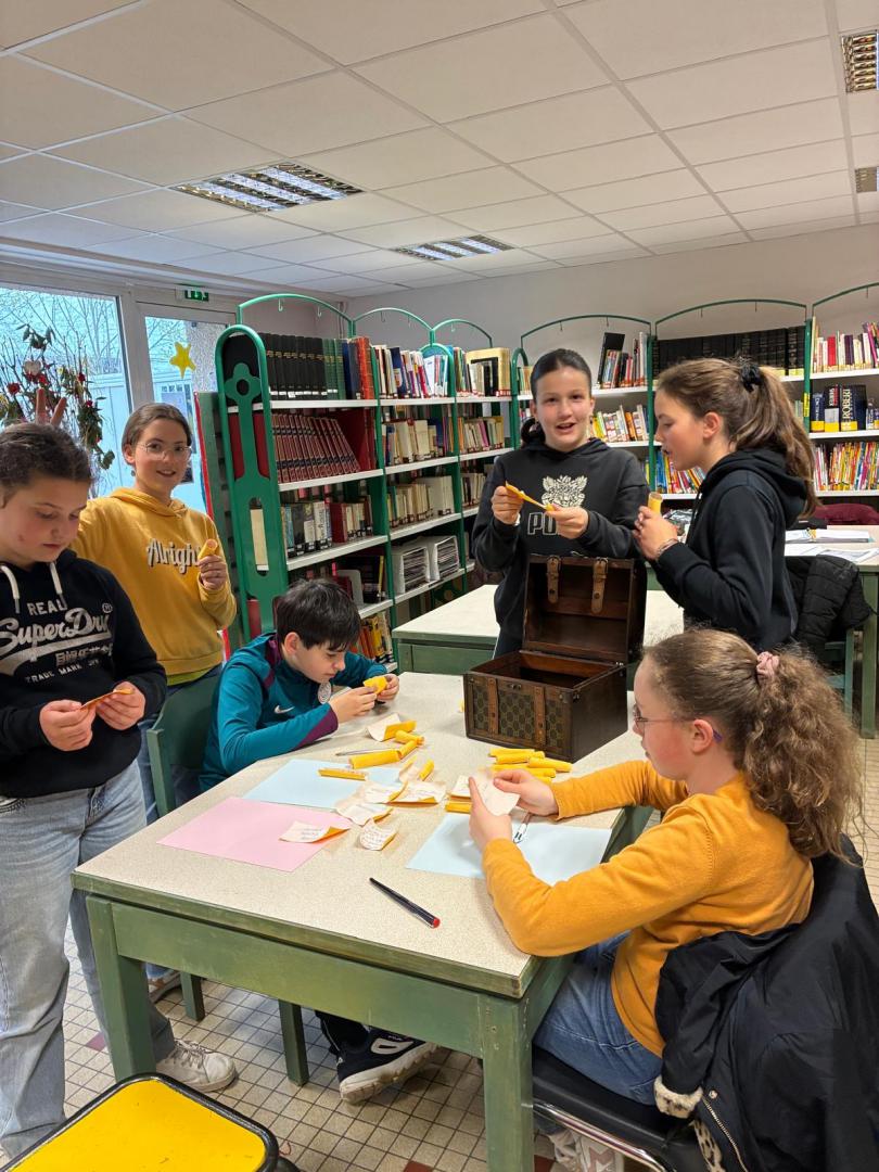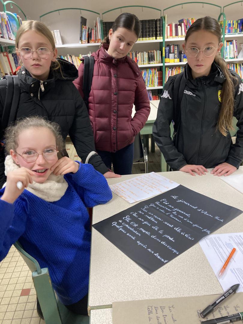 Quatre ateliers étaient proposés, parmi lesquels une séance de création poétique avec Madame L’hermet documentaliste et Madame D'Agostino, professeur de français. L'occasion d'un travail commun entre les élèves de sixième et les plus jeunes, qui n'ont pas manqué de se prêter au jeu du poème. Le dessein était de composer des tercets à partir de mots attribués au hasard.