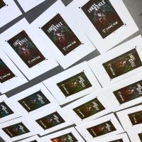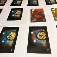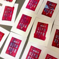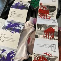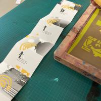 Réalisation d'un dépliant à partir de paysages exécutés à l'aide de trames et en juxtaposition d'haîkus écrits par les étudiants. Dans un second temps le visuel était réinvesti à partir d'empreintes ou de parties de films sérigraphie prélevées sur un workshop et permettant la surimpression de signes au hasard des combinaisons possibles.