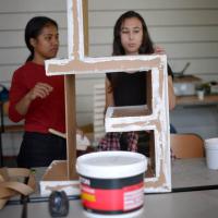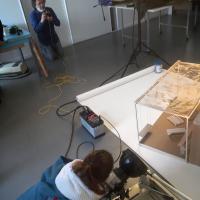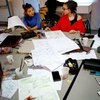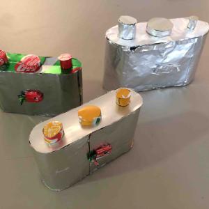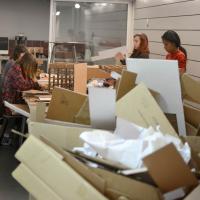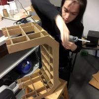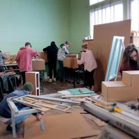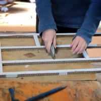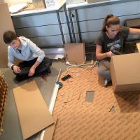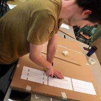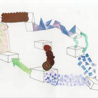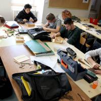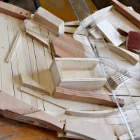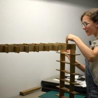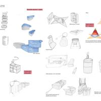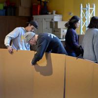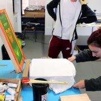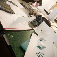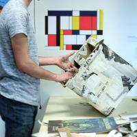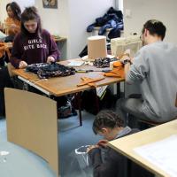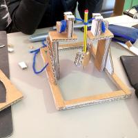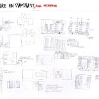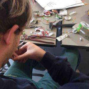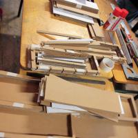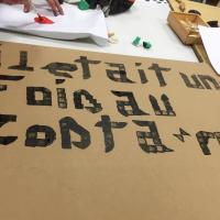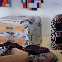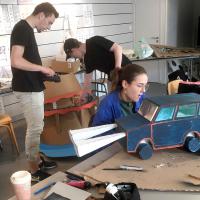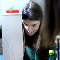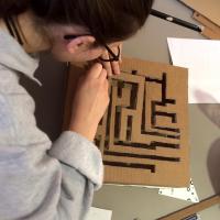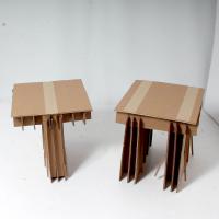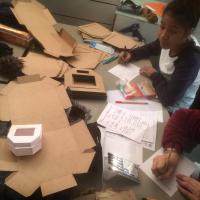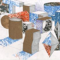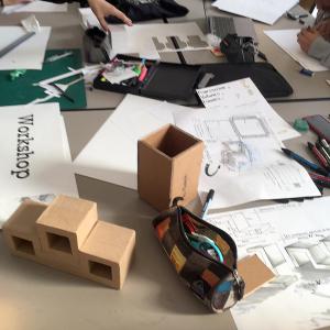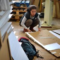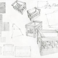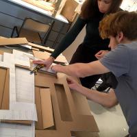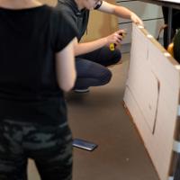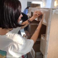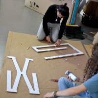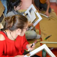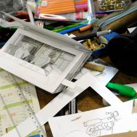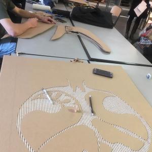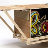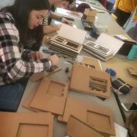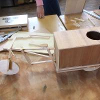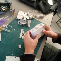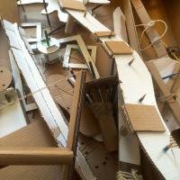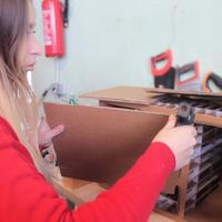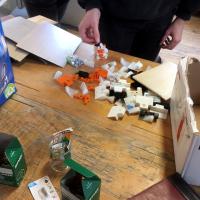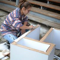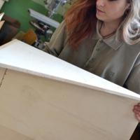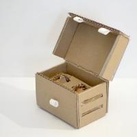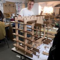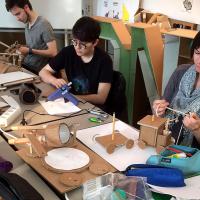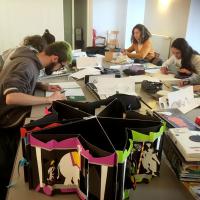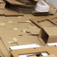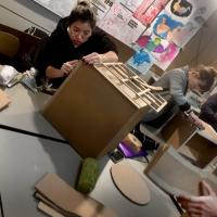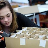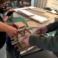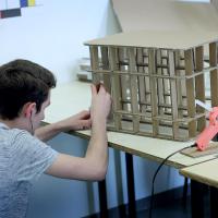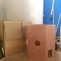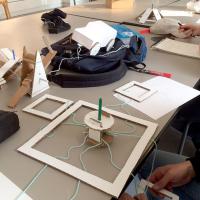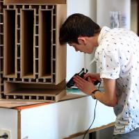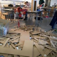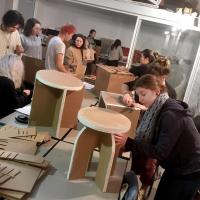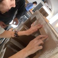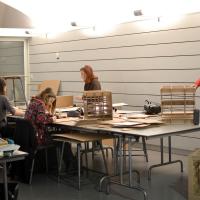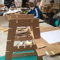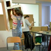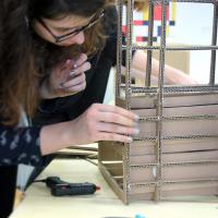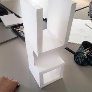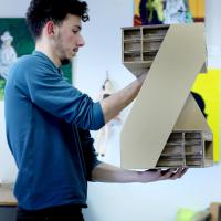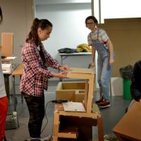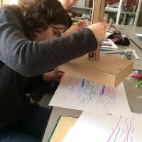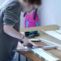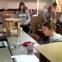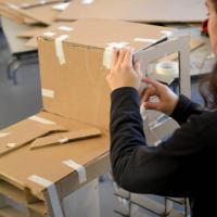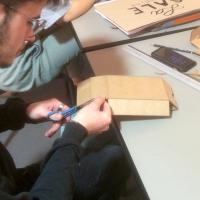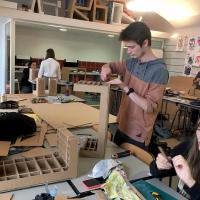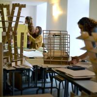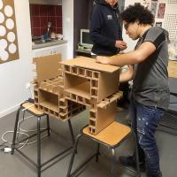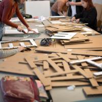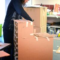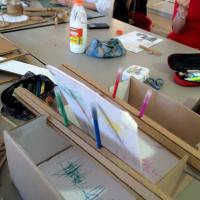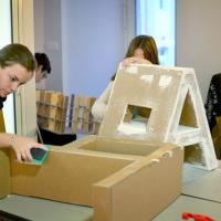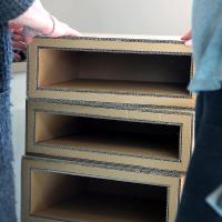 À partir d'une série de tiroirs récupérés, les élèves sont amenés à élaborer un meuble en carton. Résistance, assemblage, renforcement, finission, les différentes phases techniques permettant la mise en forme du mobilier permettent de visualiser au final un volume qui se construit autour d'un objet existant.
