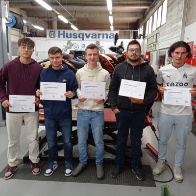 Mi-avril 2023, des élèves de la filière MV moto ont pu réaliser une mobilité Erasmus+ dans une école de Belgique à Mons (EAFC Jean Meunier). Le programmes de ces échanges était riche et varié. Après une visite de l’établissement au cours de laquelle les élèves ont pu échanger avec enseignants et élèves belges, les activités formatives débutaient : visite d’un garage de préparation de véhicule de course et participation à des activités de préparation et de contrôle. Puis, il y a eu deux jours de formation certificative VEH niveau 2 (véhicule électrique), tous les élèves ont réussi leur certification, un atout supplémentaire pour eux.