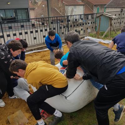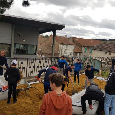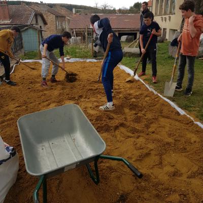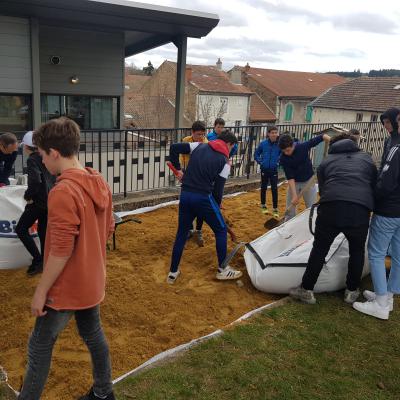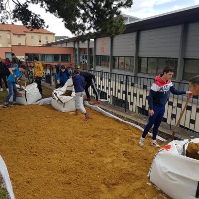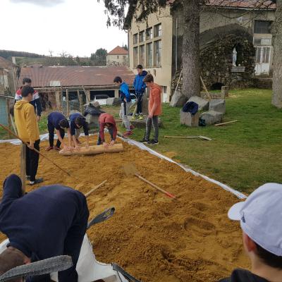 Certains éco-collégiens avaient repéré dans le parc de l'ensemble Saint Pierre - Saint Paul un espace qui pouvait permettre la création d'un boulodrome. En effet certains voudraient que l'éco-collège permette aussi de profiter des travaux réalisés au fur et à mesure du temps. Le projet serait de faire éco-collèger et boules de pétanque, en alternance, afin de diversifier les activités du vendredi. Les enseignants de l'éco-collège se sont renseignés auprès de Bigmat pour du sable spécial et les quantités. Une fois le devis en poche ils ont demandé l'accord de M. Verdun, le directeur. Le 8 avril un camion nous a livré le géotextile et plus de 6 tonnes de sable spécial. Tous les élèves étaient très motivés. Ils ont un peu nettoyé, mis en place le géotextile puis étalé le sable. Le 15 avril nous avons reçu l'accord favorable de M. Masclaux Kévin, responsable de Weldom Langogne, pour utiliser gracieusement une dameuse. Grâce à ce geste généreux les éco-collégiens ont finaliser leur boulodrome.