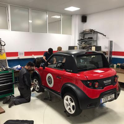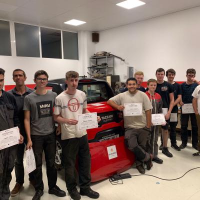 Après quelques heures de voyage et quelques péripéties, les voilà arrivés dans l’auberge de jeunesse qui les accueillera durant les 12 jours de leur séjour. Le lendemain, ils ont pu découvrir les 2 projets préparés par l’équipe d’enseignants : montage d’un véhicule électrique, une Tazzari zéro, et préparation d’un Foodtruck qui permettra aux étudiants espagnols de se restaurer lors des pauses déjeuner. En ce qui concerne le Foodtruck, les premiers jours ont été dédiés à la fabrication du plancher, mise en place des parois intérieures et préparation de l’isolation et des faisceaux électriques. Pour le second projet, il a fallu remonter la partie motorisation, transmission et freinage. Les conseils et les indications des enseignants en anglais n’ont pas toujours été faciles à comprendre, mais au fil du temps, la routine linguistique s’est installée et la communication s’est améliorée. Ensuite les élèves ont posé l’isolation et les parois intérieures du Foodtruck et finaliser le coin « machine à café », alors que le remontage de la Tazzari touché à sa fin ; assemblage des blocs de batterie, branchement du chargeur et de l’onduleur, et pour finir test de la mise en charge du véhicule.
