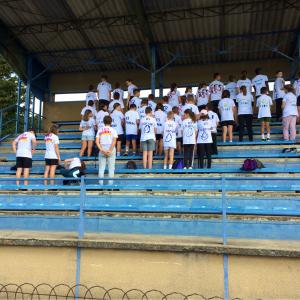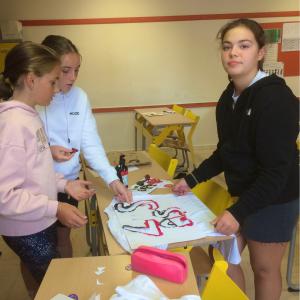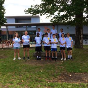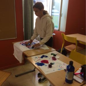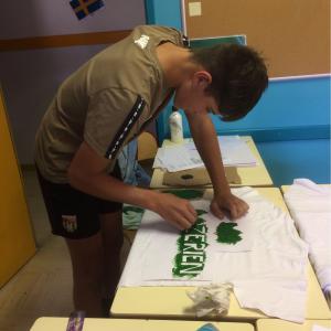 - Permettre à nos élèves de mieux se connaître et s’apprécier puisque chaque équipe est composée d’un élève par niveau : un élève de 6° avec un élève de 5° et un élève de 4° et un élève de 3°. Leurs professeurs d'Art, Mme Soeiro et Mme Redon, leur avaient fait réaliser le matin même un travail de pochoirs/pictogrammes imprimés sur sur des t-shirts blancs. C'était évidemment un travail en groupe (choisir ensemble un logo et ses couleurs)