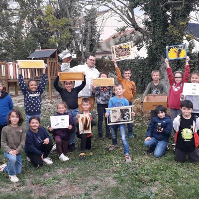 Nous avons pu bénéficier de l’intervention de Joffrey et Angélique Testard, apiculteurs. Ils nous ont permis de mieux comprendre le monde des abeilles. Grâce à leur nombreux documents et à leur ruche témoin, nous avons pu découvrir la vie fabuleuse de ce petit insecte.