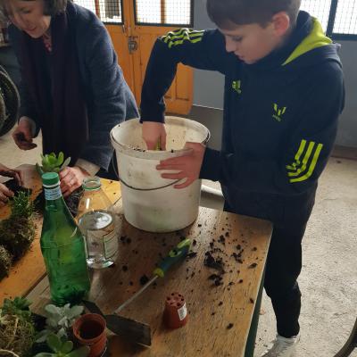 Par roulement des élèves de l’éco-collège ont donc appris à les faire. Ils se sont installés dans une salle et en petits groupes de 4-5 élèves, autour de Mme Dufour pour suivre les instructions. Le matériel a été déposé sur une grande table et progressivement les élèves ont fabriqué leurs kokedamas.