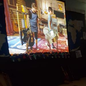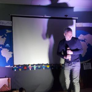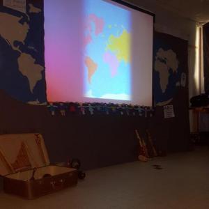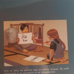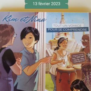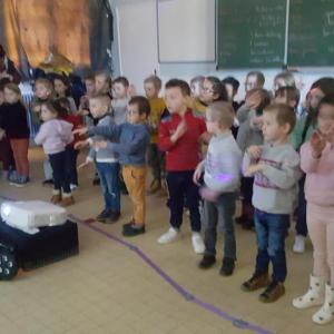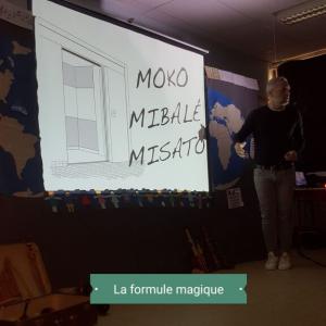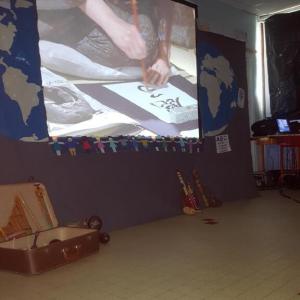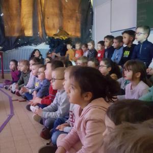 « Kim et Nina, tout un voyage pour se comprendre ». Joli spectacle de Planète Mômes, avec Eric Martin, qui a fait voyager les élèves de notre école et leurs maîtresses. Nina & Kim ne parlent pas la même langue. Pour se comprendre, ils doivent trouver la magicienne Babel. En chemin, ils rencontrent un dessinateur, un musicien et un maître d’école, venus de différents pays. Nina & Kim dessinent ensemble, font de la musique ensemble et apprennent petit à petit à communiquer et à mieux se connaître.