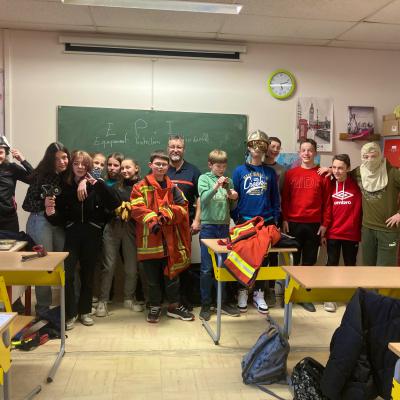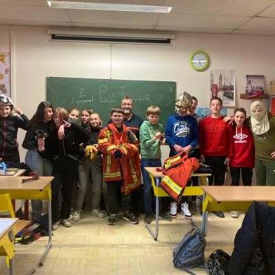 De nouveau 14 collégiens de Saint Pierre - Saint Paul de Langogne étaient au rendez-vous avec Monsieur Brunel, pompier de Langogne, pour cette seconde rencontre. Cette rencontre avait pour but d’évoquer le matériel des pompiers : les tenues (mais aussi les lances).