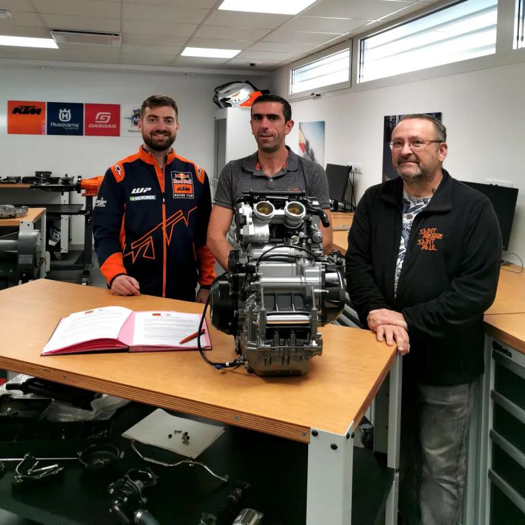 Notre région est un haut lieu de l’enduro en France et il paraissait naturel de solliciter la marque internationale afin que nos élèves puissent bénéficier de leurs compétences. C’est dans ce contexte qu’une convention de partenariat a été signé entre KTM France et le lycée Saint Pierre - Saint Paul pendant les vacances de Toussaint. Cette dernière consiste à des mises à disposition de matériel et de documentations techniques, participation des enseignants aux différentes formations proposées durant l’année. A cette occasion, Mrs Moulin et Brassac se sont rendus au siège social situé à Saint Priest dans la banlieue lyonnaise. Accueilli par des responsables de la formation, ils ont pu visiter les plateaux techniques dans lesquels sont organisées les formations professionnelles, les ateliers réservés aux VAE (Vélos à Assistance Electrique), le secteur média qui organise les présentations des nouveaux modèles clients.