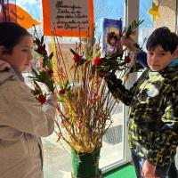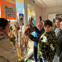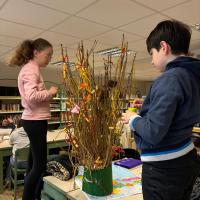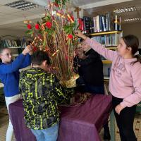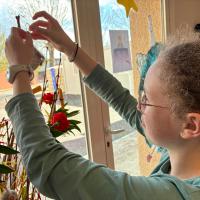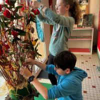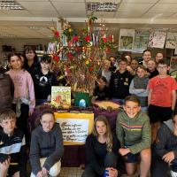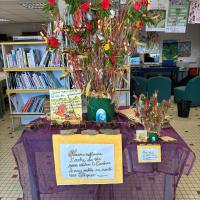 Pour vivre pleinement le temps de Carême, qui s’étend sur 40 jours avant la fête de Pâques, et afin de nous préparer à accueillir la joie de cet événement sacré. Le club ”lecture culture” du CDI a décidé d’élaborer un Arbre de Vie. Ce projet invitant chacun à s’engager dans une expérience collective empreinte de symbolisme et de partage. À l’origine, notre arbre se compose de branches mortes reposant sur une souche, symbolisant le cycle perpétuel de la vie, de la mort et de la résurrection. Chaque participant a été convié à écrire une intention de prière, un petit message ou un vœu sur un carré de papier couleur soleil roulé puis lié par du raphia rouge et jaune avant d’être suspendu sur les branches mortes de l’arbre. Ces messages anonymes, porteurs d’espoir et de bienveillance, sont venus peu à peu orner notre arbre, insufflant une touche de vie à ce qui semblait d’abord désolé. Chaque note accrochée représentant une pensée précieuse, un désir de transformation ou une réflexion personnelle, créant ainsi un lien invisible entre tous. Au fil du Carême, ces messages ont donné naissance à de délicats bourgeons, symbolisant les promesses de renouveau. L’arbre, jadis mort et dénudé, s’est métamorphosé en un véritable symbole d’espoir et de renaissance. Ces messages, entourés de papier couleur soleil, évoquant le cœur des futures fleurs qui s’épanouiront pour Pâques.