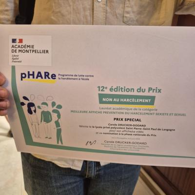 Pour la 5ème année consécutive, les élèves de seconde B du lycée Saint Pierre - Saint Paul, ont participé au concours non au harcèlement, fruit d’un projet initié en EMC (enseignement moral et civique) en partenariat avec leur cours de PAO (Publication Assistée par Ordinateur). Après débats, idées et propositions, les élèves ont mis en forme leur affiche en PAO. Ce lundi 2 juin 2025 avait lieu la remise des prix au rectorat de Montpellier, Léonie et Arthur ont reçu de la part de la nouvelle rectrice, Mme Carole Drucker-Godard, le prix spécial dans la catégorie affiche de prévention du harcèlement sexiste et sexuel. Cette cérémonie à mis en lumière l’engagement et la créativité des jeunes élèves qui ont su aborder avec sensibilité et pertinence un sujet d’une importance capitale dans notre société. Le concours NAH, organisé chaque année, vise à encourager les élèves à s'exprimer sur des sujets de société et à développer des outils de prévention contre le harcèlement sous toutes ses formes (affiches et vidéos catégorie primaire collège et lycée). Félicitations aux élèves de seconde B pour cette belle réussite et pour leur contribution à la lutte contre le harcèlement sexiste et sexuel. Leur engagement est une source d'inspiration pour tous et rappelle l'importance de continuer à sensibiliser et à éduquer sur ces enjeux cruciaux.