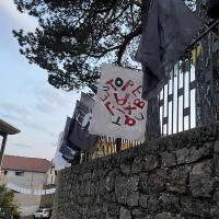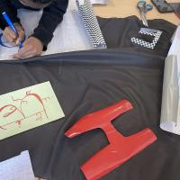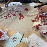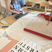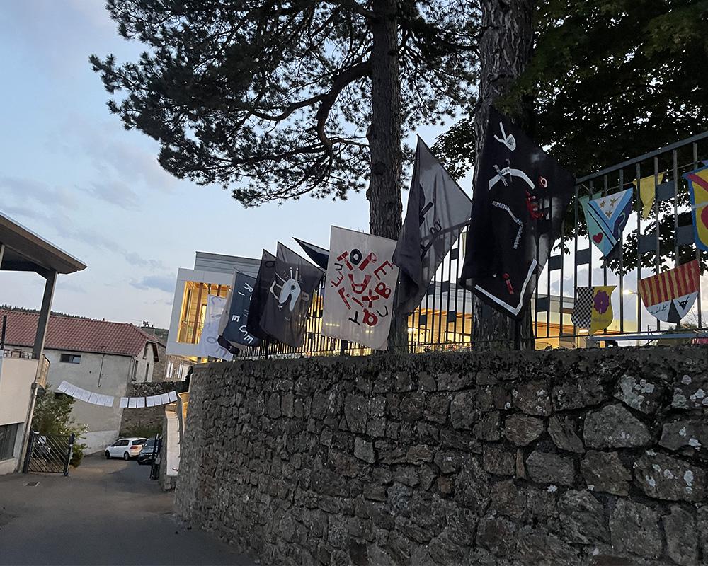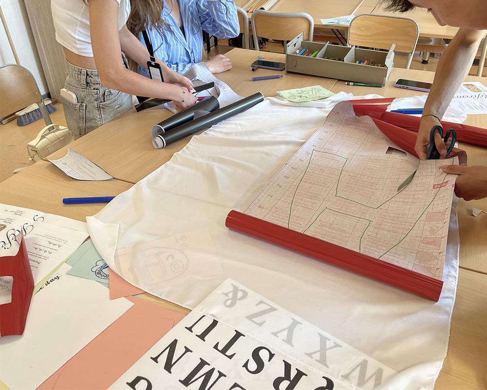 Les élèves ont d’abord travaillé autour des émotions, qu’ils ont traduites en mots, mêlant alphabet latin et cyrillique pour composer un poème collectif. De cette matière sensible est née une production plastique : un « drapeau émotionnel », où lettres et symboles deviennent rythmes graphiques et couleurs de l’émotion partagée.