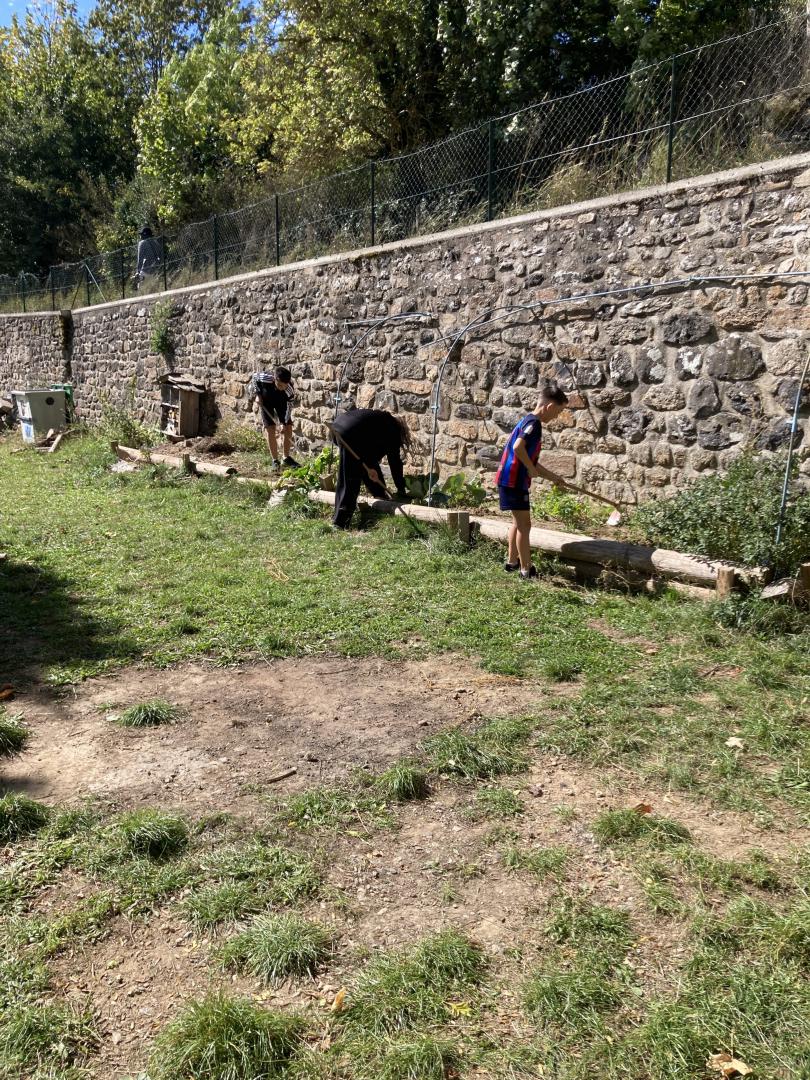 Sur ces photos on peut voir les élèves arroser, désherber et retourner le terrain potager après avoir récupérer des graines de radis, de salades, d'arroches…