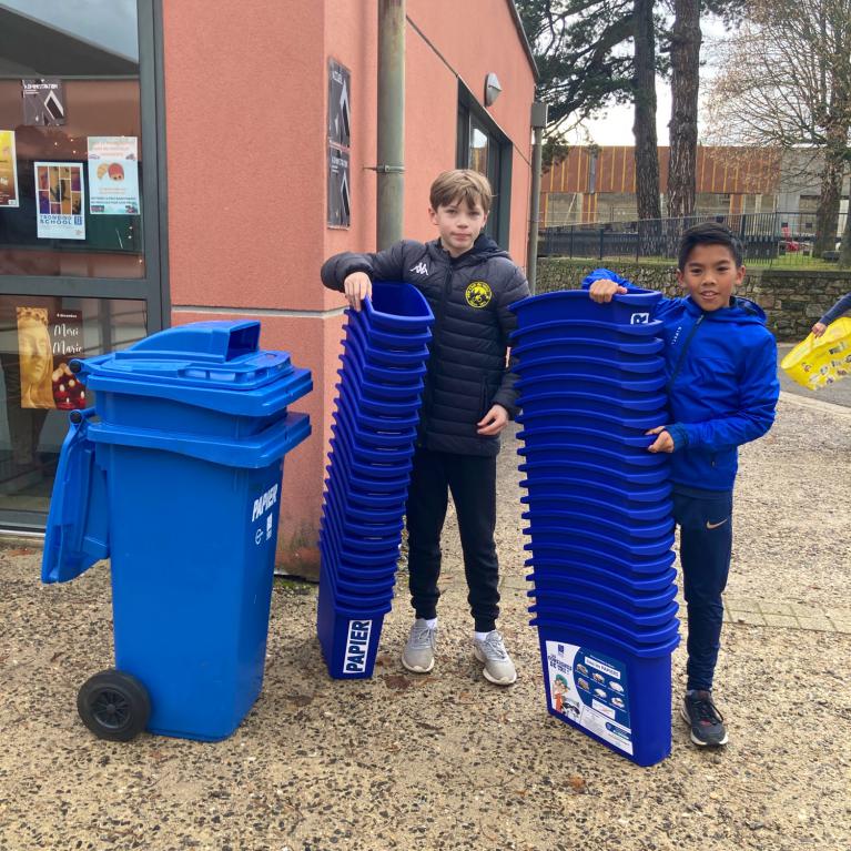 Les éco-collégiens ont enfin réceptionné des poubelles accordées par le SDEE de la Lozère pour équiper toutes les salles de l'ensemble Saint Pierre - Saint Paul. Ces poubelles ont l'avantage d'avoir un format et une couleur permettant de bien les visualiser en classe. Des informations simplifiées permettent de rappeler les bons gestes pour le tri du papier. Même la salle des professeurs en a été équipée. Les salles d'Arts sont même dotées de poubelles à grand format.