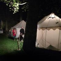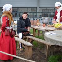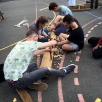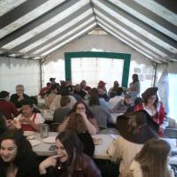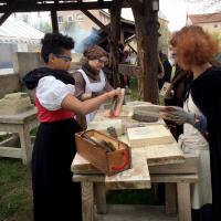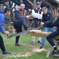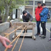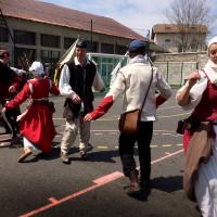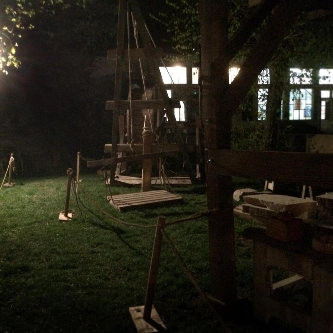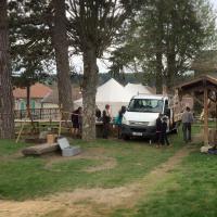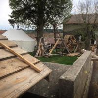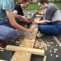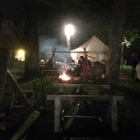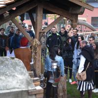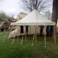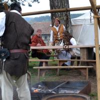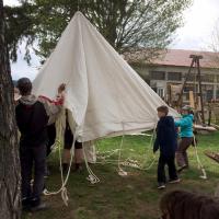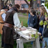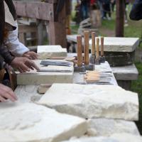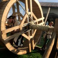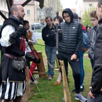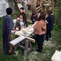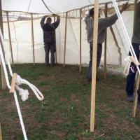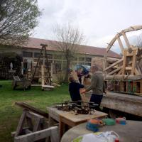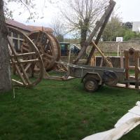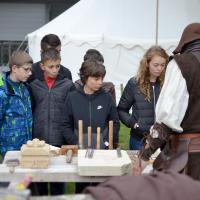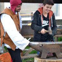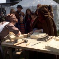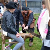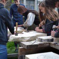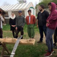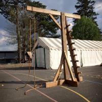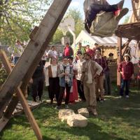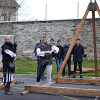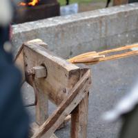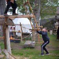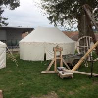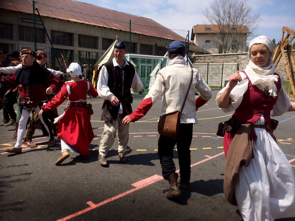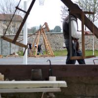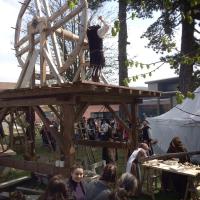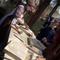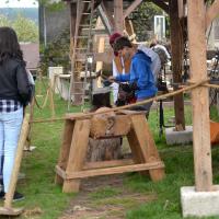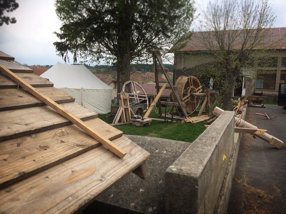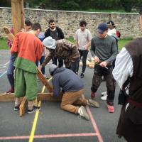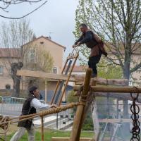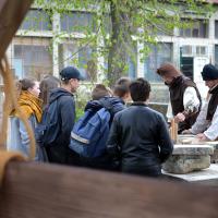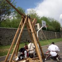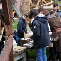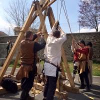 Après avoir construit le camp durant le week-end précédent la compagnie des « Bâtisseurs d'Antan » se montrait opérationnelle le vendredi 4 mai dès 7h30 du matin pour accueillir au portail les collégiens et lycéens devant participer aux divers ateliers consacrés aux métiers d'autrefois. Toutes les demi-heures les différents groupes s’essayaient à la forge, auprès du tailleur de pierre, auprès des scieurs de planches et des tresseurs de corde. Sortis du cadre scolaire ordinaire, ils pouvaient expérimenter Pythagore autrement qu'à travers le théorème, ils découvraient la corde à nœuds et les chiffres 3,4,5 bien connus des artisans pour déterminer un angle droit. Les diverses activités les ramenaient à la dure pénibilité des tâches physiques du scieur de bois, du poids des outils, de la répétition des gestes. Vers 19h ils revenaient accompagnés de leurs parents pour profiter des grillades et diverses victuailles, banquet organisé par les parents de l'Apel. Pendant ce temps nos gens en costumes festoyaient autour du feu de camp et en partageant un repas traditionnel cuit dans la marmite et dont les effluves éveillaient les sens. En soirée ils reprenaient la main en entrainant les trainards dans des danses traditionnelles et d'époque. Evoluant au rythme naturel du soleil, c'est donc très tôt que la compagnie était sur pied pour accueillir le samedi les élèves de BTS en design graphique et de produits. L'équipe pédagogique en accord avec les « Bâtisseurs d'Antan » avaient préparé les projets en amont pour chaque classe à travers l'élaboration de maquettes ou de dessins. Les élèves de design de produits avaient pour mission de construire un engin de levage à l’échelle 1 de plus de 3 m de haut, assemblé par emboitement et grâce à des chevilles en bois. Le second groupe prenait possession de l'atelier du tailleur de pierre et passait la journée à finaliser leur bestiaire dans le dur. L'ensemble des intervenants se retrouvait le soir pour partager un aligot cuisiné par les élèves de BTS en mécanique. La journée de samedi était l'occasion de recevoir les habitants de Langogne qui, timides le matin, dès 14h investissaient les lieux pour assister aux ateliers et aux démonstrations des « Mercenaires » en arme, seconde compagnie en démonstration le samedi. Combats en armure, tir à la bricole (catapulte de petite taille) occupaient la cour de l'établissement scolaire au grand bonheur des enfant set adultes présents.