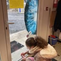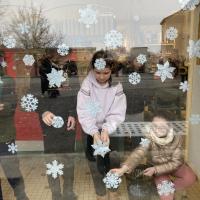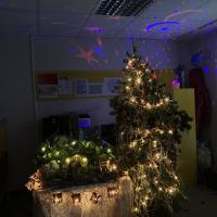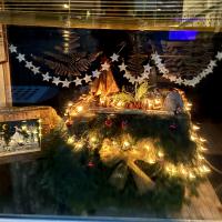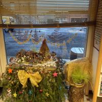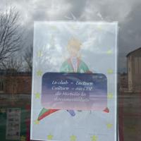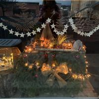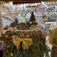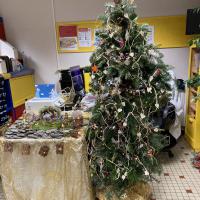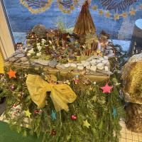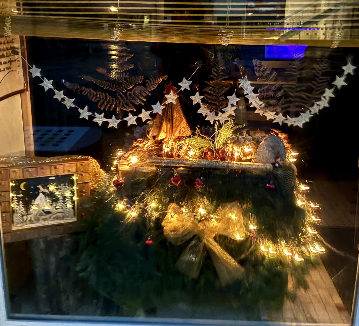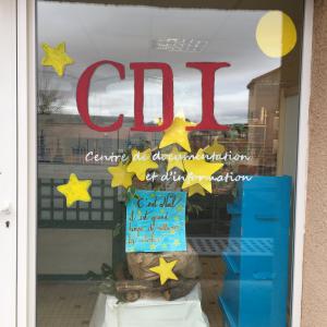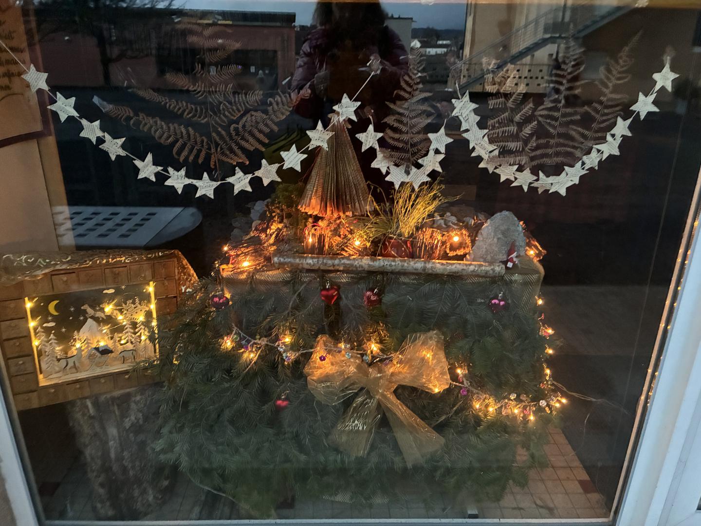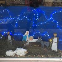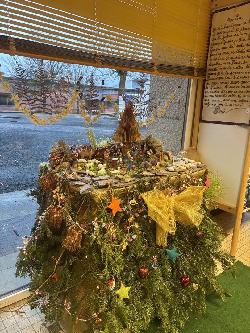 Pour Noël, Mireille prépare une belle crèche avec des santons d’une belle taille, sur fond de ciel bleu marial avec des étoiles jaunes étincelantes. Quand le soir tombe, la vitrine du CDI s’arbore de mille feux. Les élèves comme les adultes sont émerveillés.