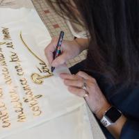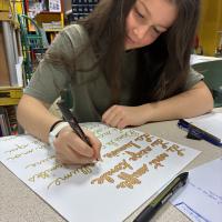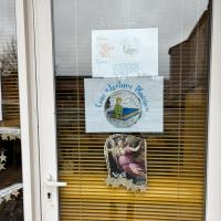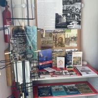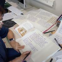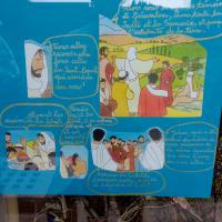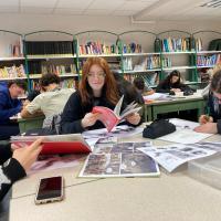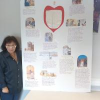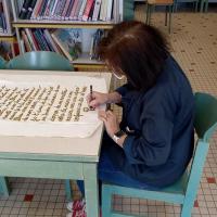 De son côté, Mireille rédige longuement la vie du saint sur des feuilles, qu’elle dépose sur de larges panneaux à destination des élèves ; la vitrine du CDI témoigne de son travail minutieux.