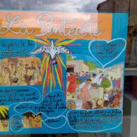 Pour l’Ascension, Mireille fait une belle affiche qui rappelle les paroles de Jésus avant de monter au Ciel. Les images en couleurs touchent les cœurs. Pendant ce temps, en ce mois de mai, - mois de Marie -, Anne fleurit les statues du lycée : la Vierge et la petite Thérèse. L’équipe ne chôme pas !