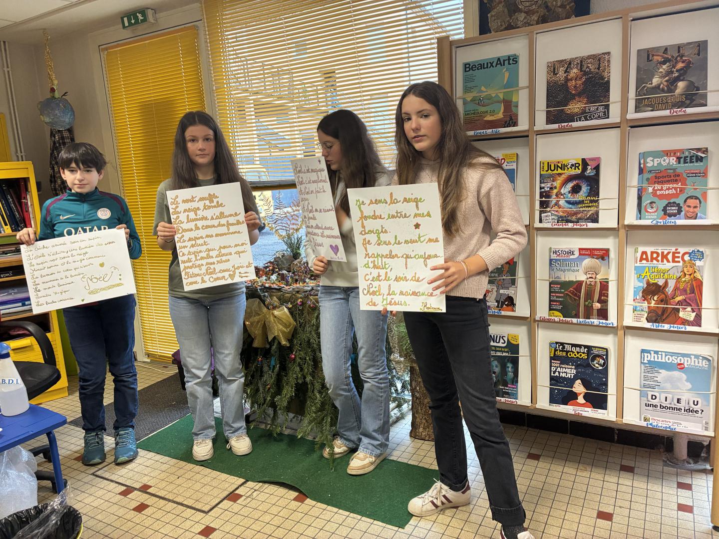 Cette préparation a été un moment de bonheur partagé, où les rires et les sourires ont illuminé le CDI à l’approche de Noël. Les enfants étaient si fiers de voir leur travail transformer l’espace en un véritable havre de lumière, en attendant la naissance de Jésus.