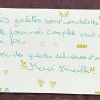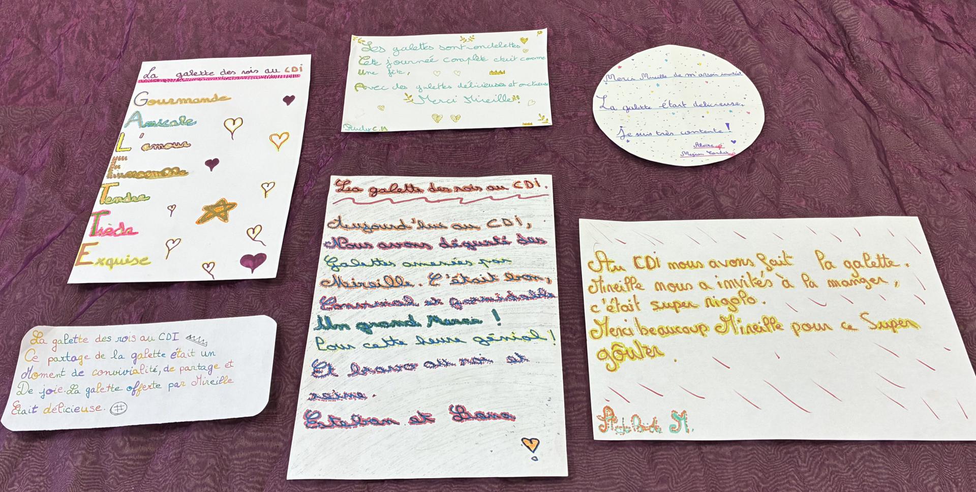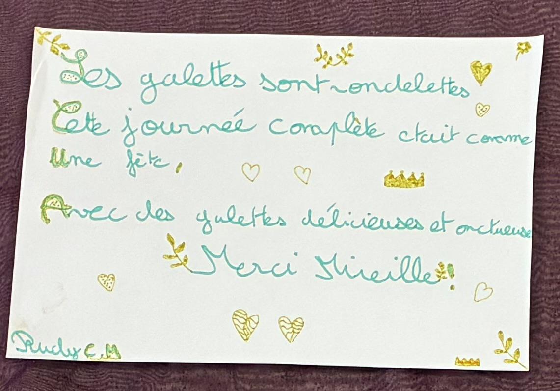 Les deux galettes, l’une au caramel beurre salé et l’autre au chocolat, ont ravi les élèves. Dans une atmosphère festive, le roi et la reine ont été désignés. Après avoir dégusté la galette, les élèves ont partagé leurs impressions sur ce moment chaleureux, sous forme de petits poèmes ou d’acrostiches :