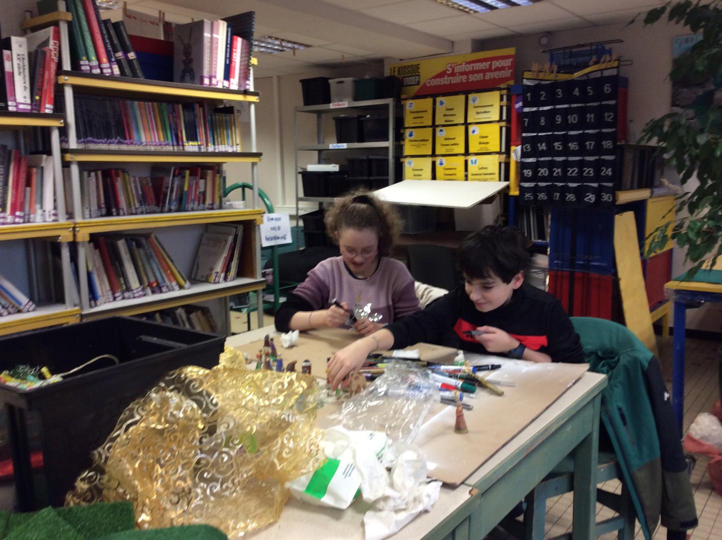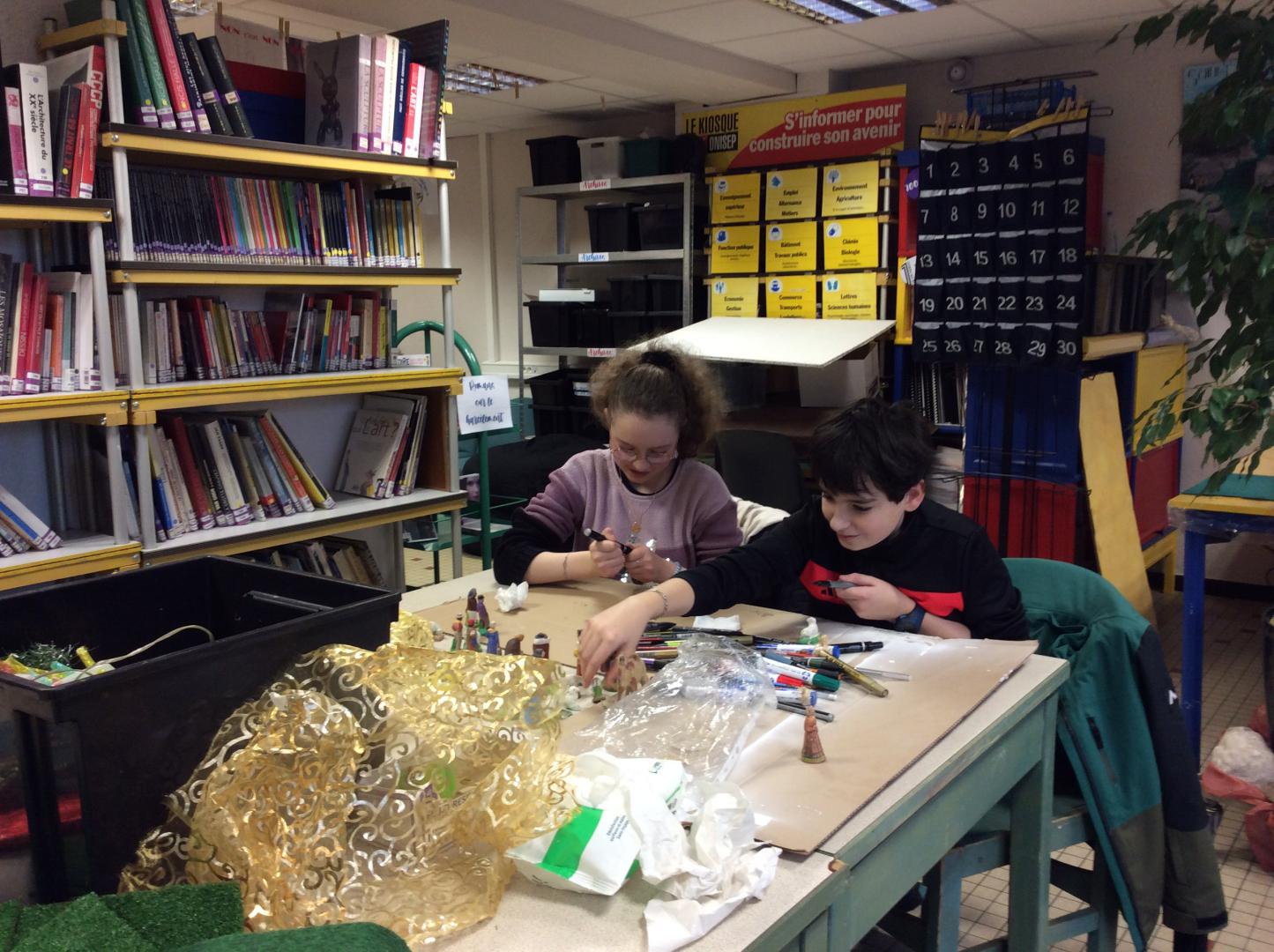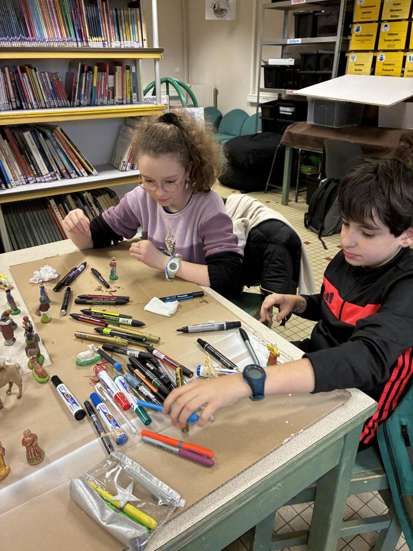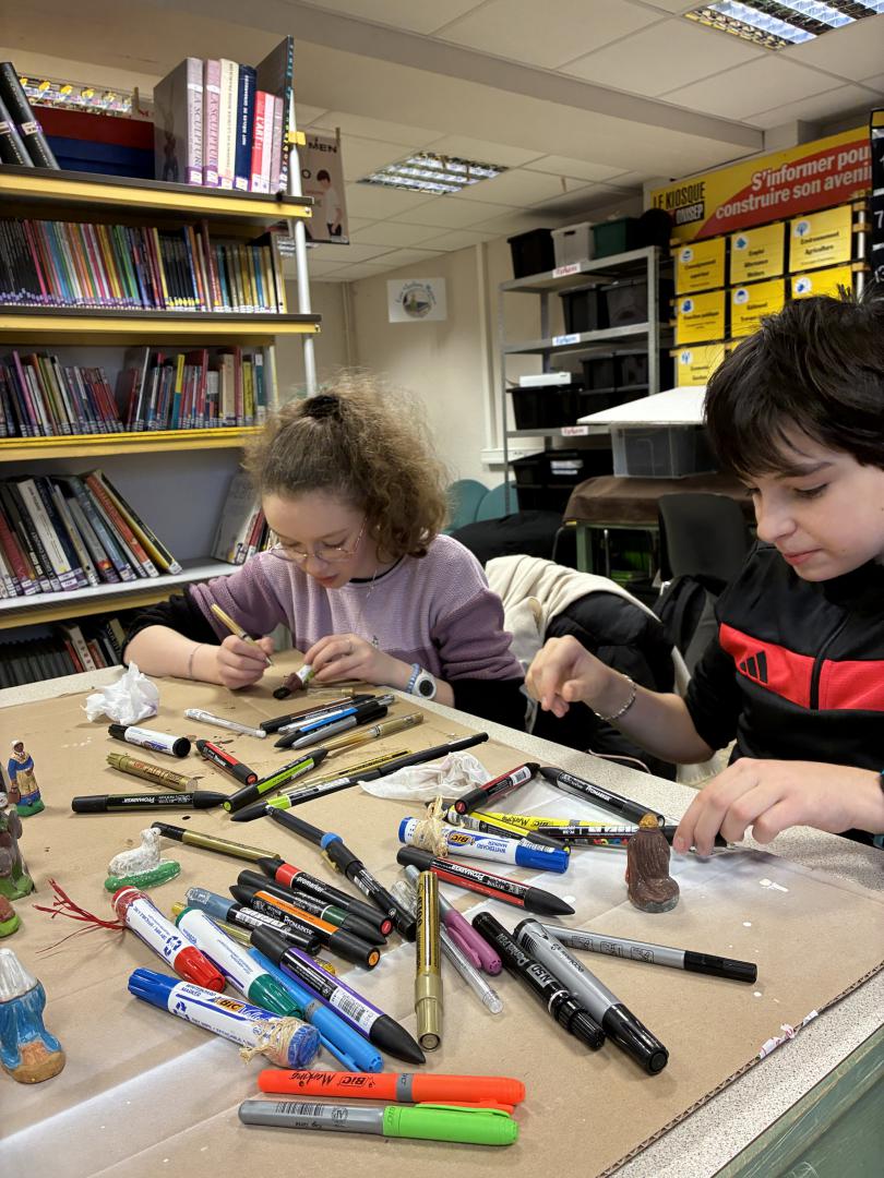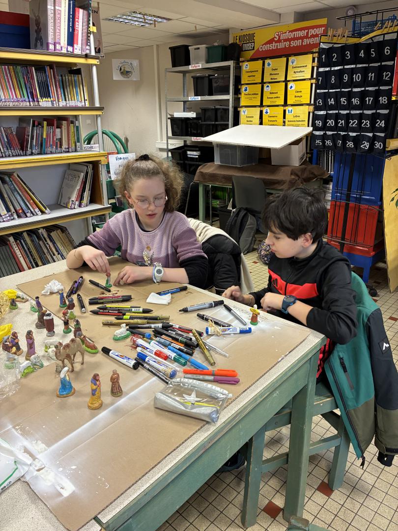 Le 3 décembre, nous avons ouvert les cartons de décorations et constaté que les santons des enfants de Mireille avaient terni. Avec Rudy et Léna, nous avons entrepris leur restauration en les dépoussiérant, en apportant des retouches et en les polissant. À présent, l’esprit de Noël commence à s’installer dans le CDI.