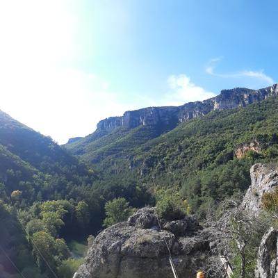 C’est sous un beau soleil, ce jeudi 8 octobre, que les étudiants en BTS Maintenance des véhicules et les Terminales Bac Pro se rendaient à La Roque Sainte Marguerite dans les Gorges de la Dourbie. Départ à 7h15 direction le village de La Roque pour commencer la journée par une randonnée de 10 km environ pour atteindre les hauteurs du village et profiter des quelques magnifiques points de vue. Au bout de 4 km nous atteignons le village de Montméjean et les ruines de son château, ensuite direction la Corniche du Rajol et les Rochers de Roque Altés qui nous apercevons au bout de 7 km. Un peu plus tard, au loin se dessine « les voiles » du Viaduc de Millau qui enjambe la vallée du Lot. De là, redescente dans le sentier du Ravin des Chenevières pour atteindre un sentier longeant la Dourbie qui nous ramène enfin au village de La Roque (après environ 15 km grâce à une erreur de notre guide !!!!). Après un pique-nique salvateur, et un brin de repos bien mérité, la seconde activité de la journée pouvait débuter. Au programme, via ferrata au-dessus des Gorges, tyroliennes interminables, ponts de singe et pas mal de rigolades aussi. Tout ceci encadré par les animateurs de la base de loisirs Roc et Canyon de Millau. Malgré l’appréhension et la peur pour certains d’évoluer au-dessus du vide, c’est avec de grands sourires que tous ont pu apprécier cette après-midi partagée entre les élèves et les enseignants, qui ont aussi donné de leur personne.