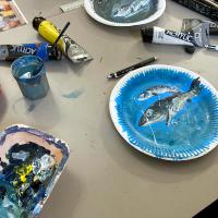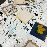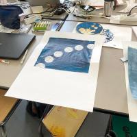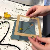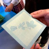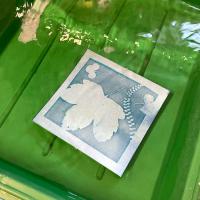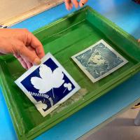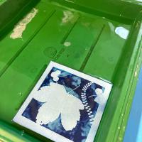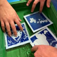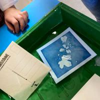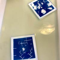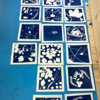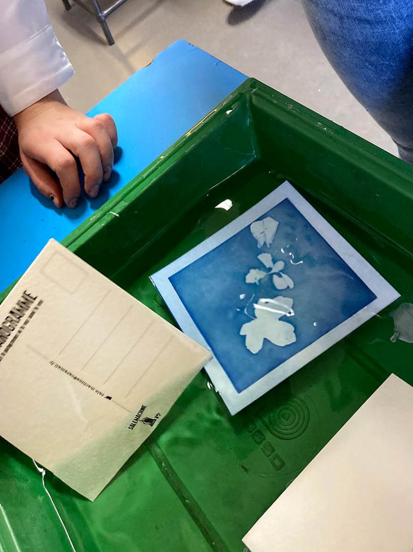 Les élèves abordent par le biais de cette atelier les principes de l'insolation et la maîtrise des produits photosensibles. Ils se réalisent des productions à partir de végétaux dont les formes viennent épargner le papier et contraster avec le fond bleu, caractéristique de la technique
