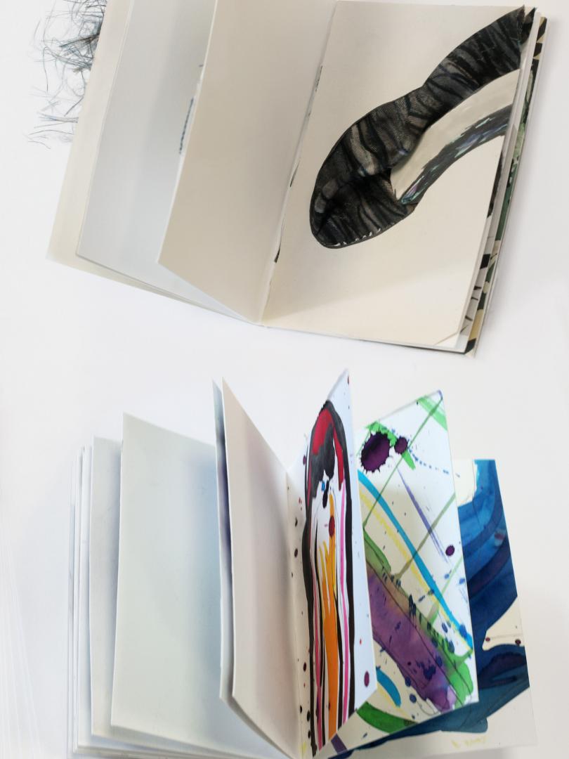 Les élèves réalisent une série de livre en accordéon mettant en scène des séquences du cinéma muet ou expérimental en huit images clés.