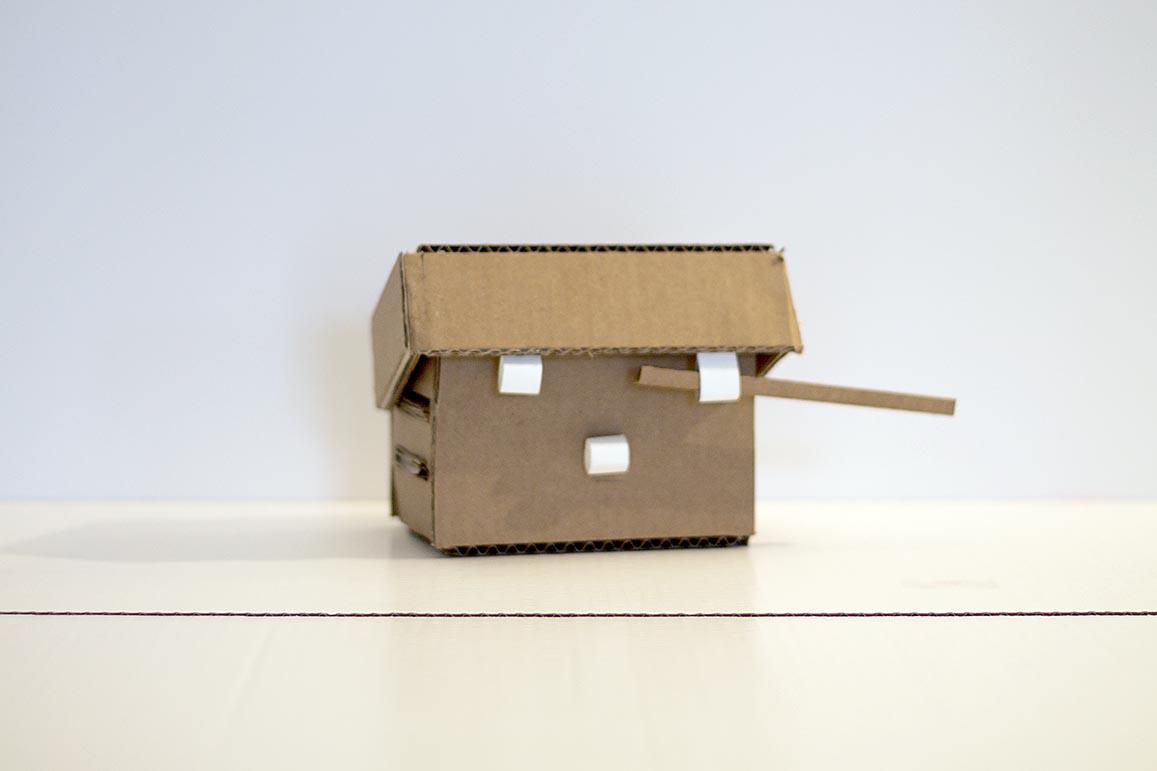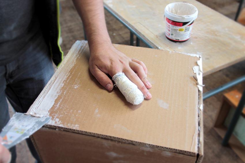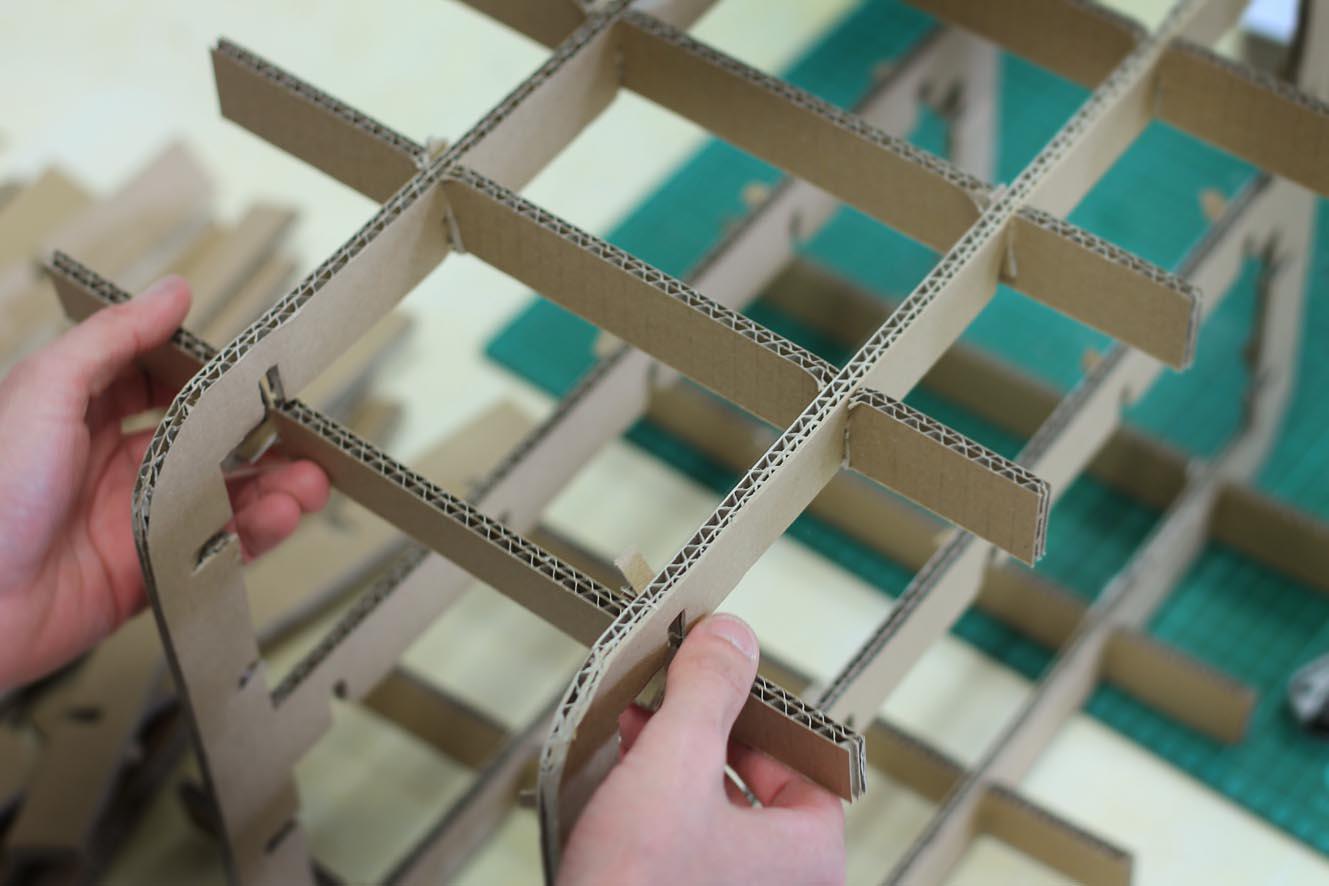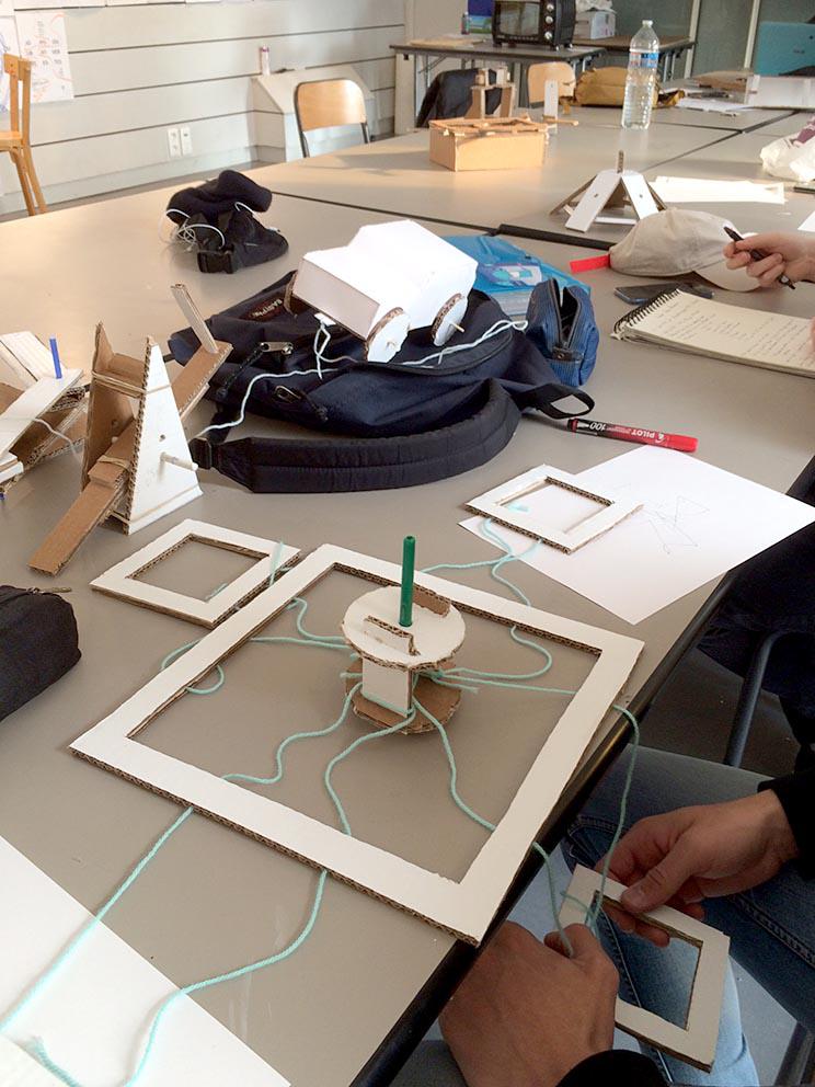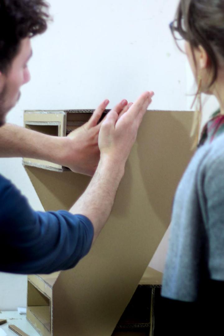 À partir d'une série de tiroirs récupérés, les élèves sont amenés à élaborer un meuble en carton. Résistance, assemblage, renforcement, finission, les différentes phases techniques permettant la mise en forme du mobilier permettent de visualiser au final un volume qui se construit autour d'un objet existant.