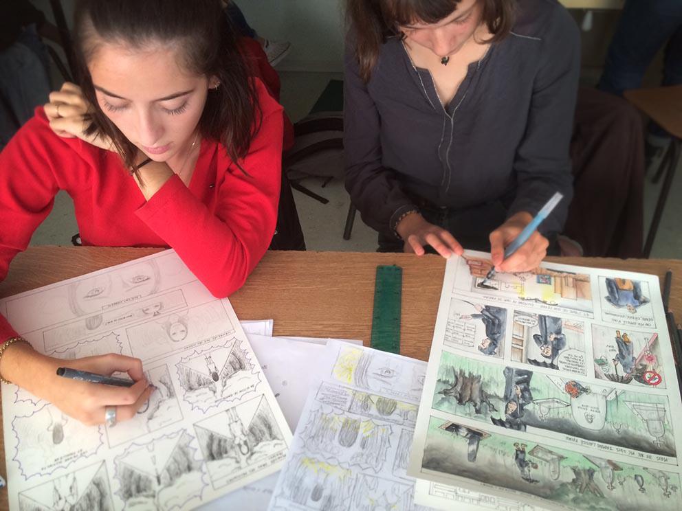 Les élèves découvrent la construction d’une bande dessinée, à travers la conception et réalisation d’une histoire au format A3, du scénario à la production en passant par toutes les phases de recherches.