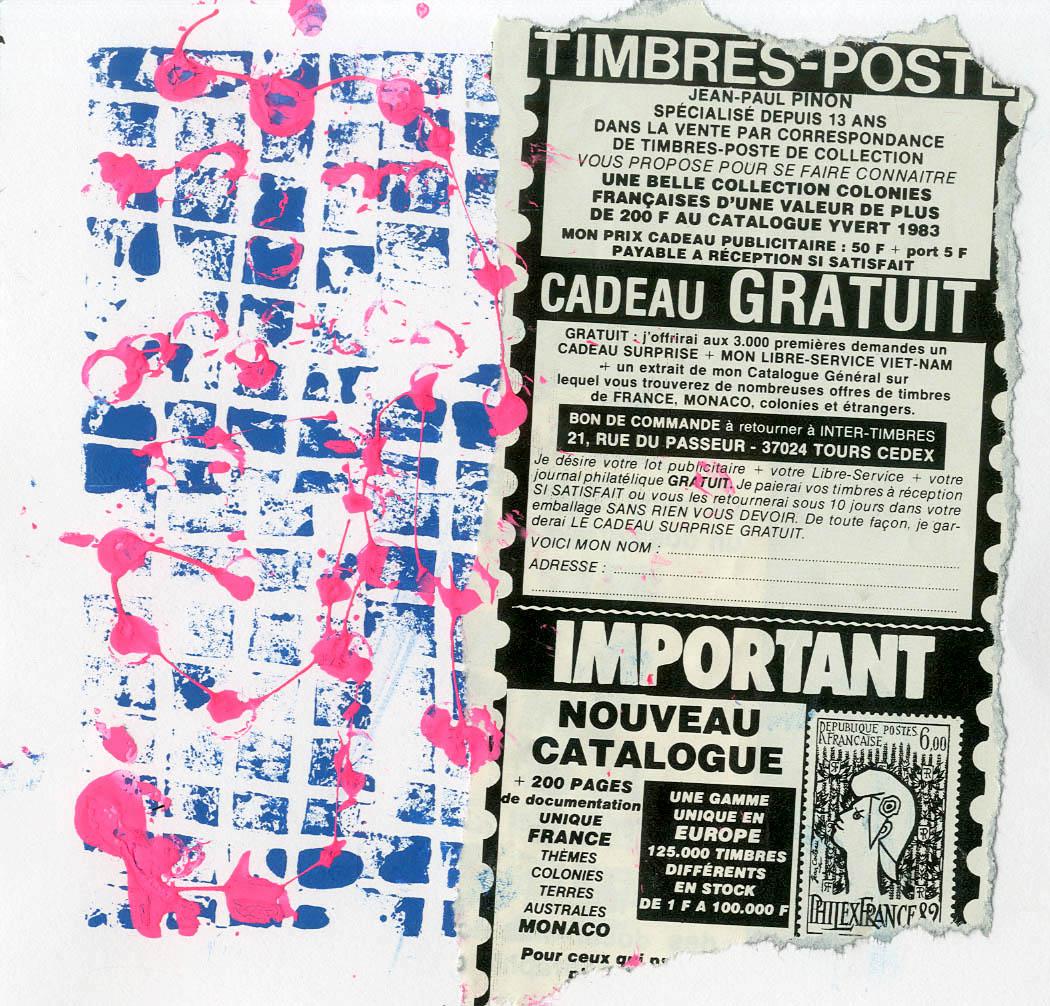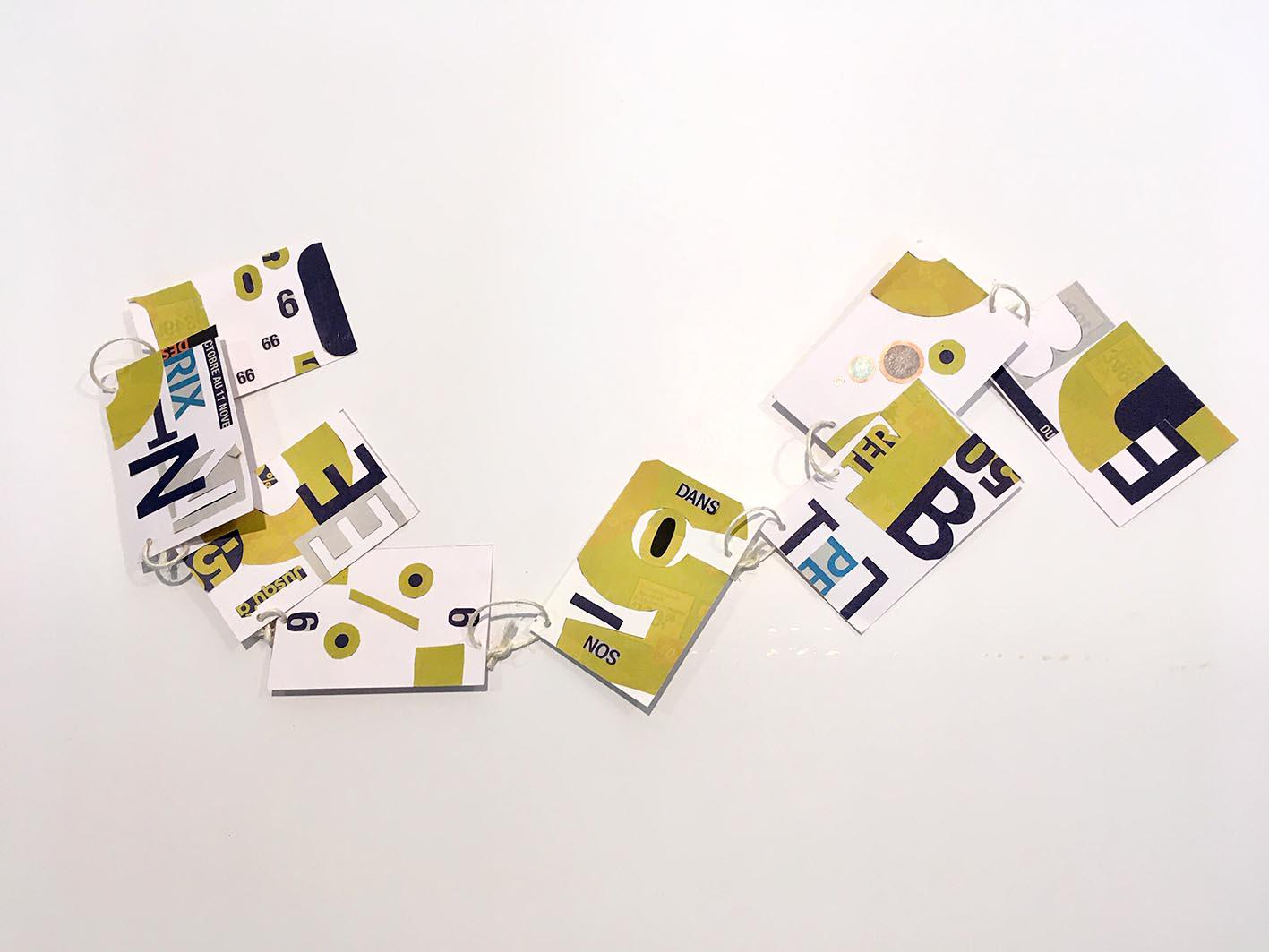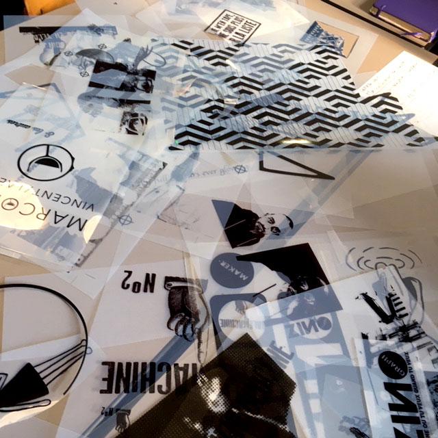A partir des films de sérigraphie usagés, les DNMADe DG1 sont invités à recomposer des visuels en mêlant ces chutes et en proposant un tirage en 2 couleurs. Compositions abstraites, confrontations des morceaux de signes et des couleurs.